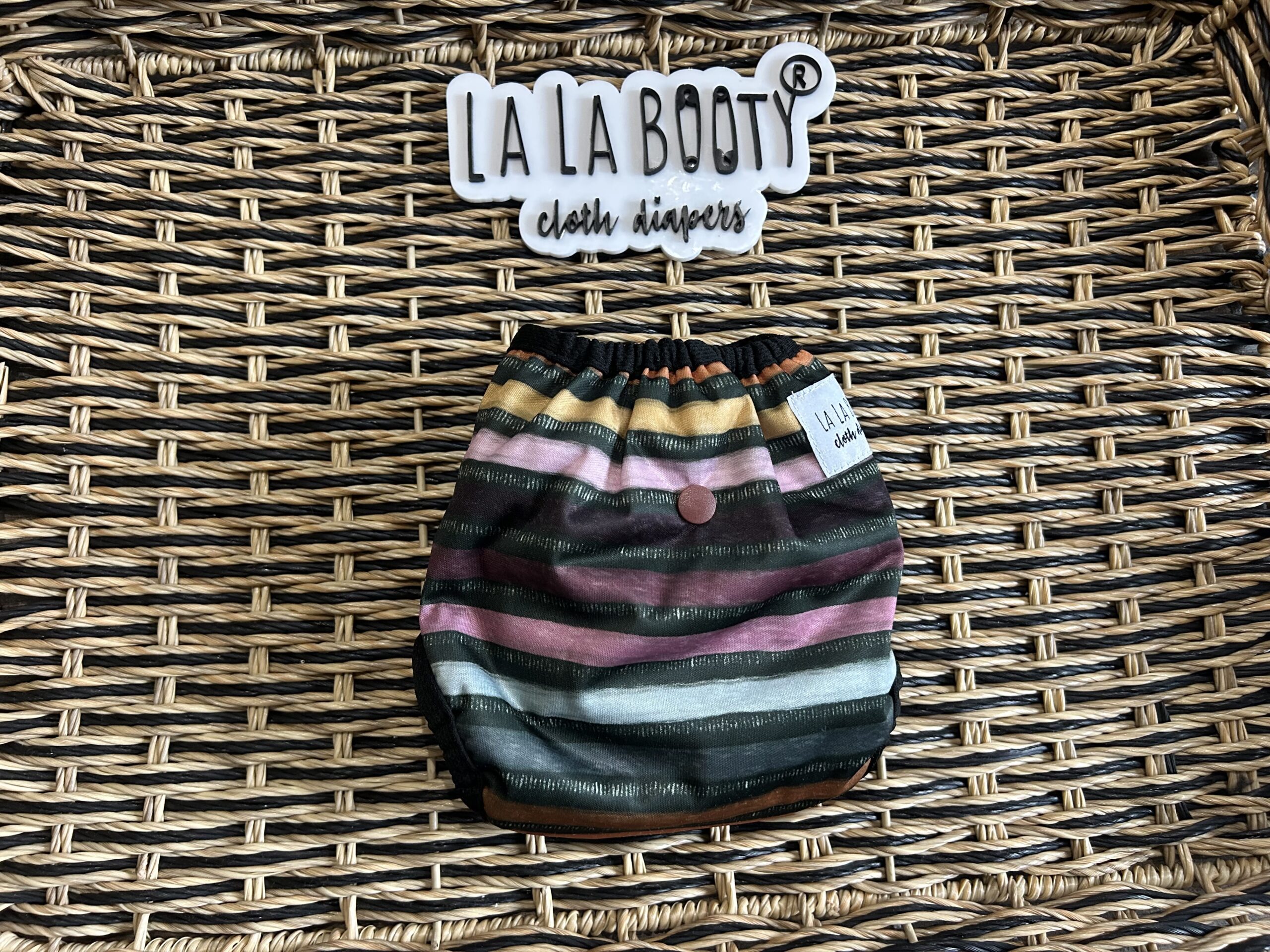 This design features front elastic, an umbilical cord snap down, rise snaps to adjust the length, lower level hip snaps, pop up gussets if you want to use them over a fitted, prefold, flat or preflat. The snap for the insert is in the back to pair with the matching littlest (newborn) sized inserts.