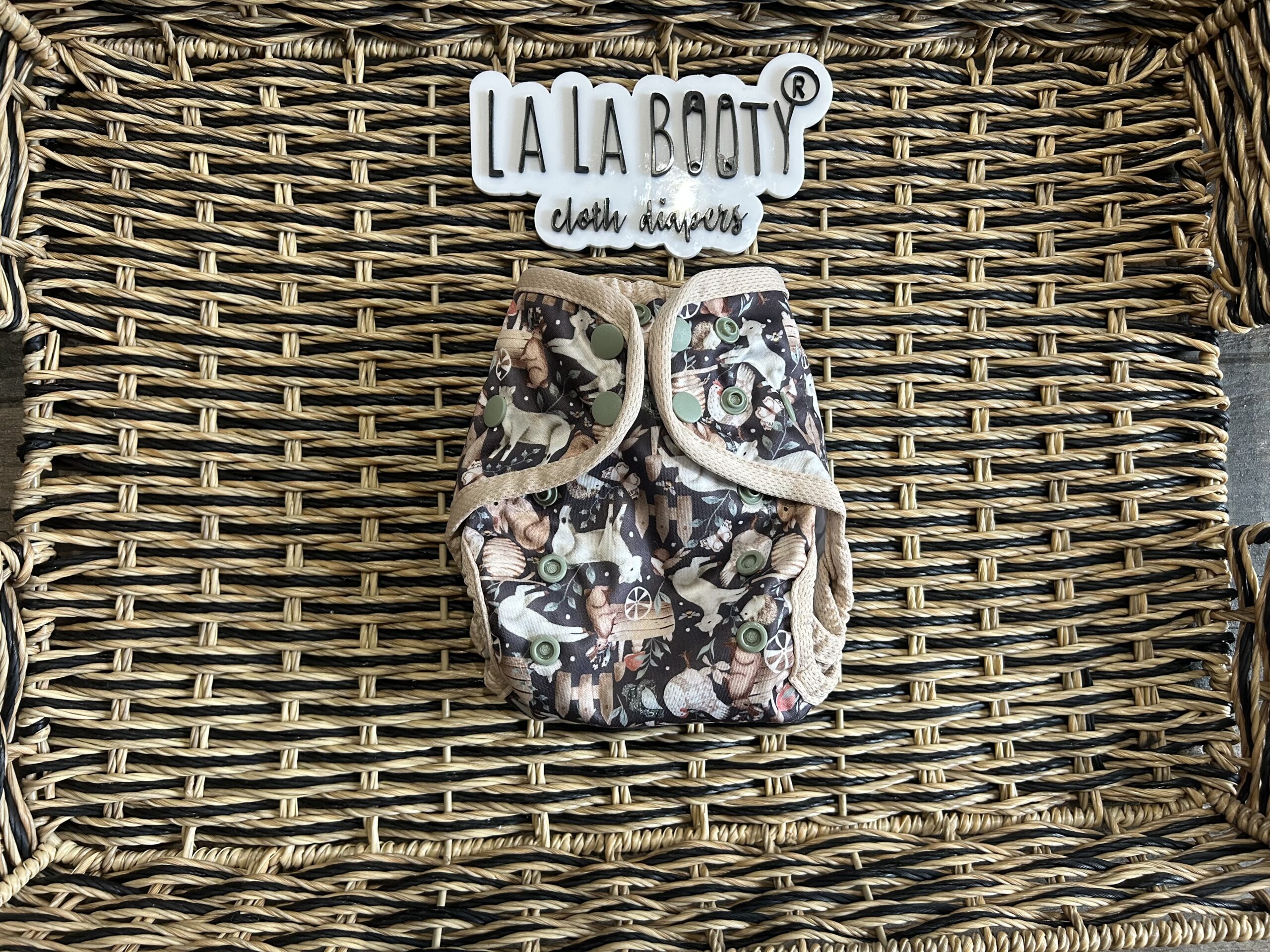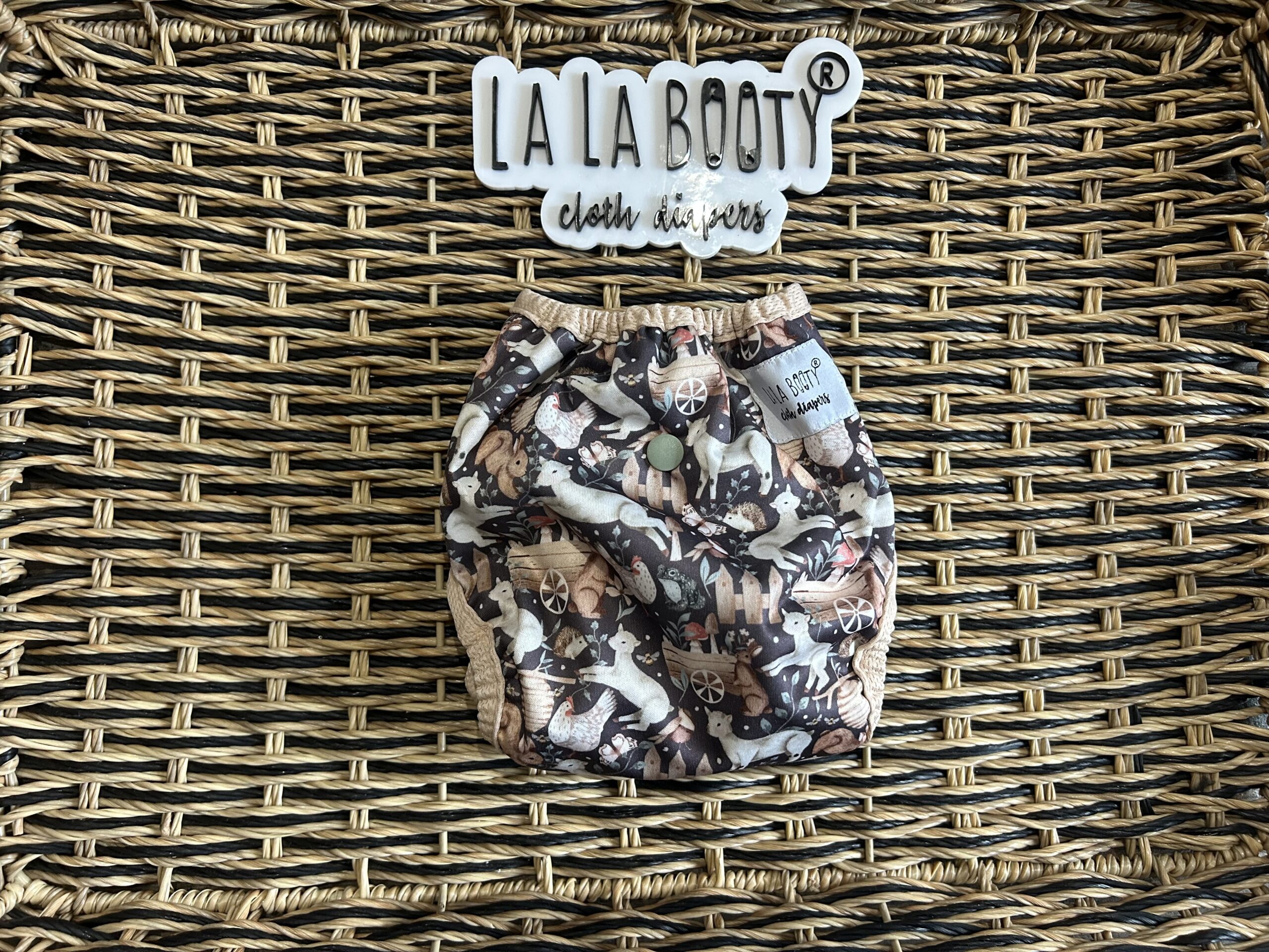 This design features front elastic, an umbilical cord snap down, rise snaps to adjust the length, lower level hip snaps, pop up gussets if you want to use them over a fitted, prefold, flat or preflat. The snap for the insert is in the back to pair with the matching littlest (newborn) sized inserts.