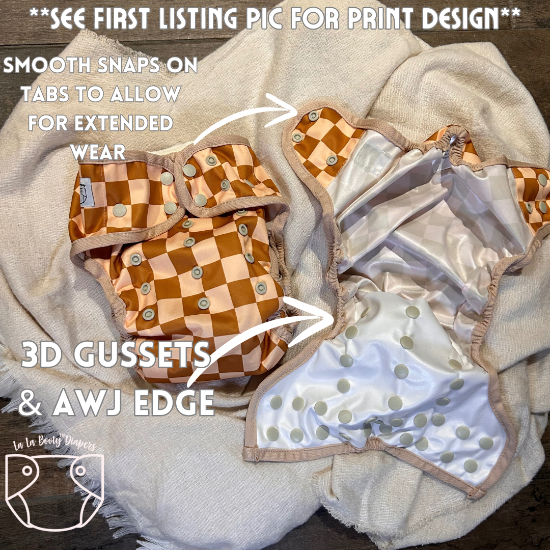 This design features front elasics to be flush against the skin over the fitted tabs, pop up style double gussets, adjustable rise snaps, and no front or back panels making it wipeable.