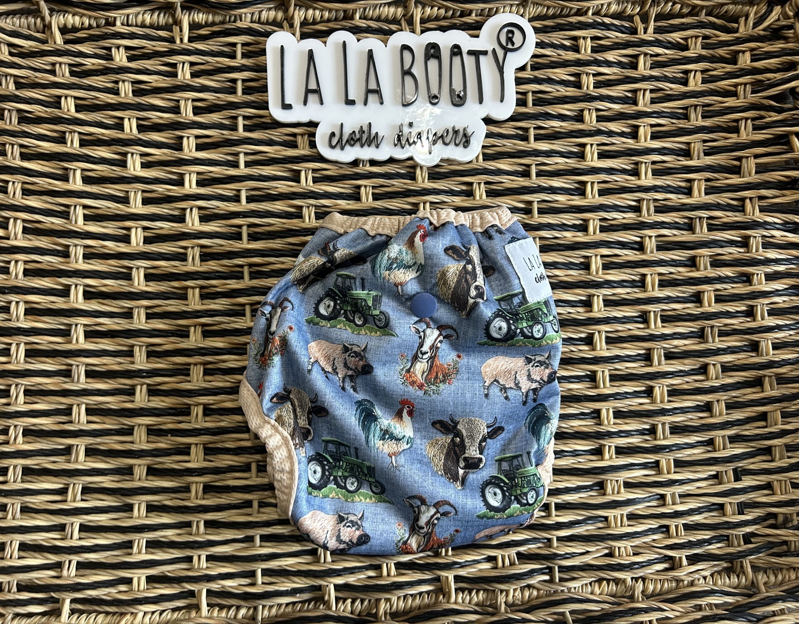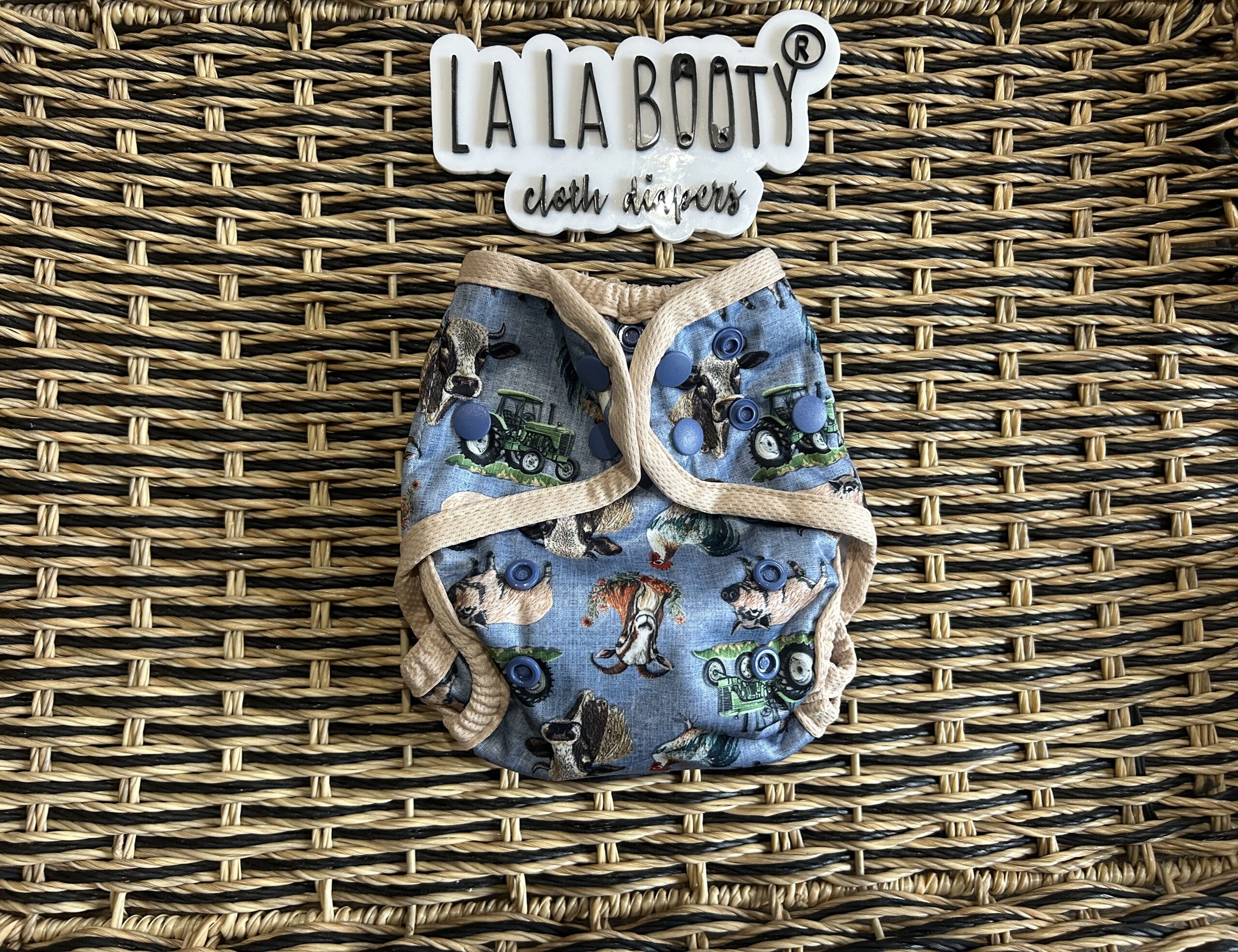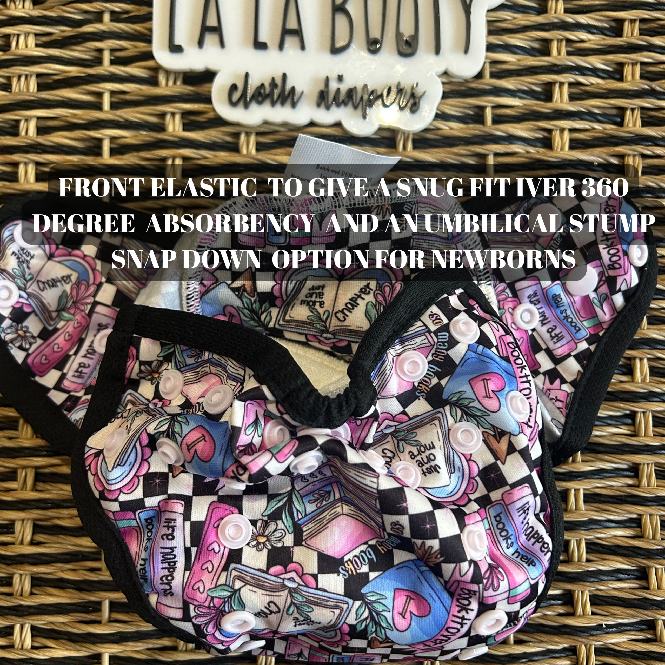 This design features front elastic, an umbilical cord snap down, rise snaps to adjust the length, lower level hip snaps, pop up gussets if you want to use them over a fitted, prefold, flat or preflat. The snap for the insert is in the back to pair with the matching littlest (newborn) sized inserts.
