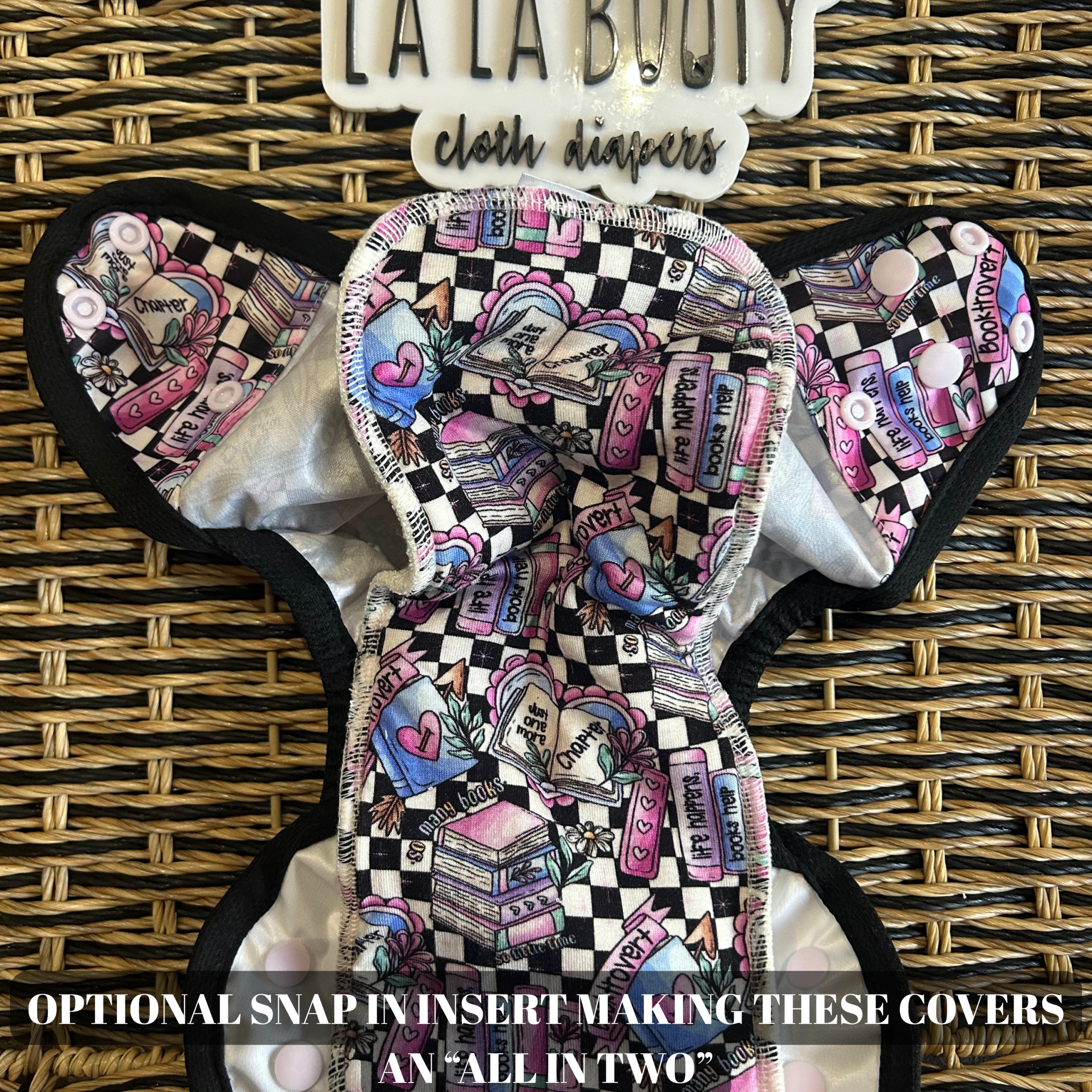 Cover cloth diapers are the outer shell and do not come with absorbency sewn in. This style is called an All in Two style because it has a snap for an insert to snap in.