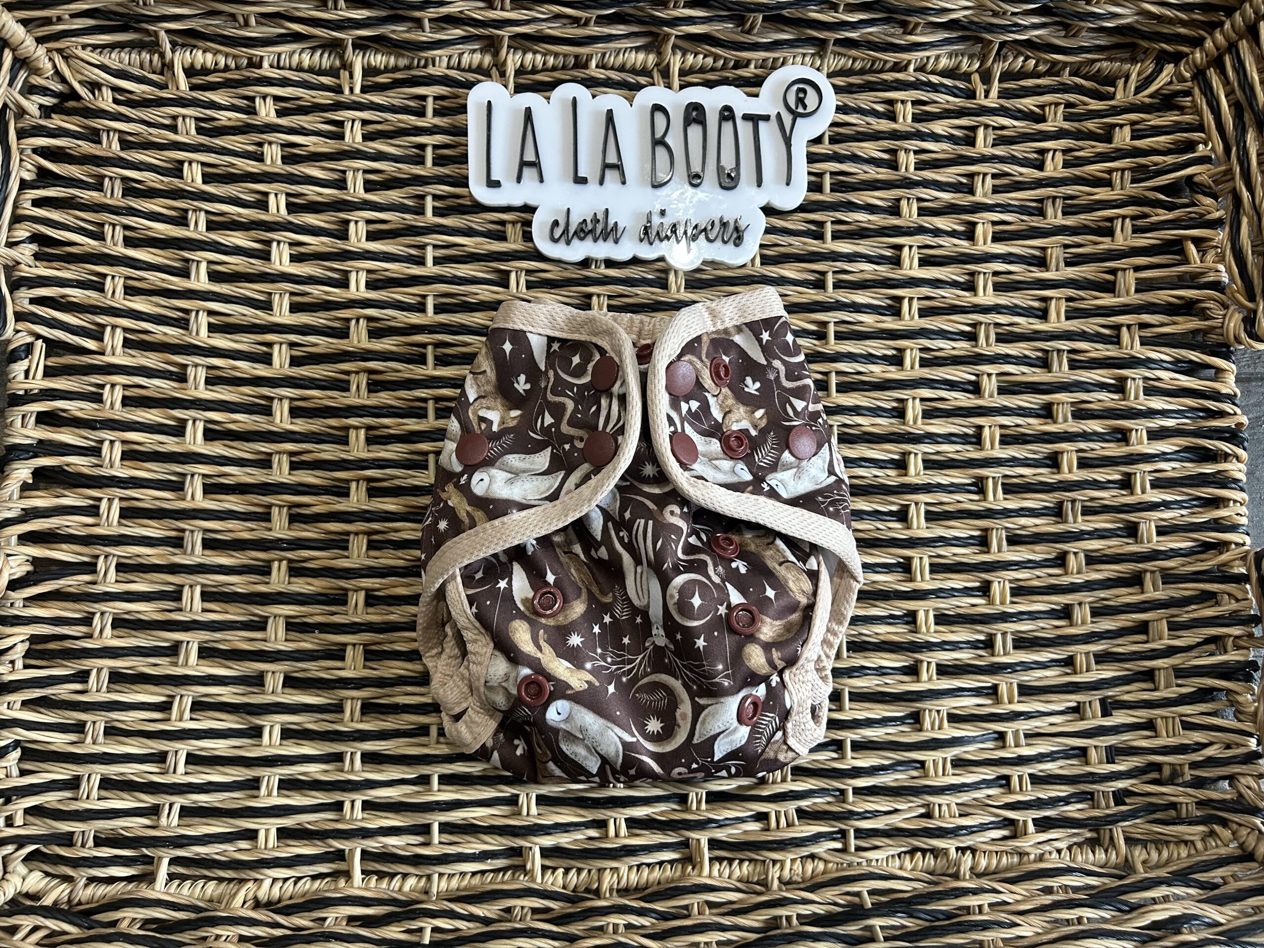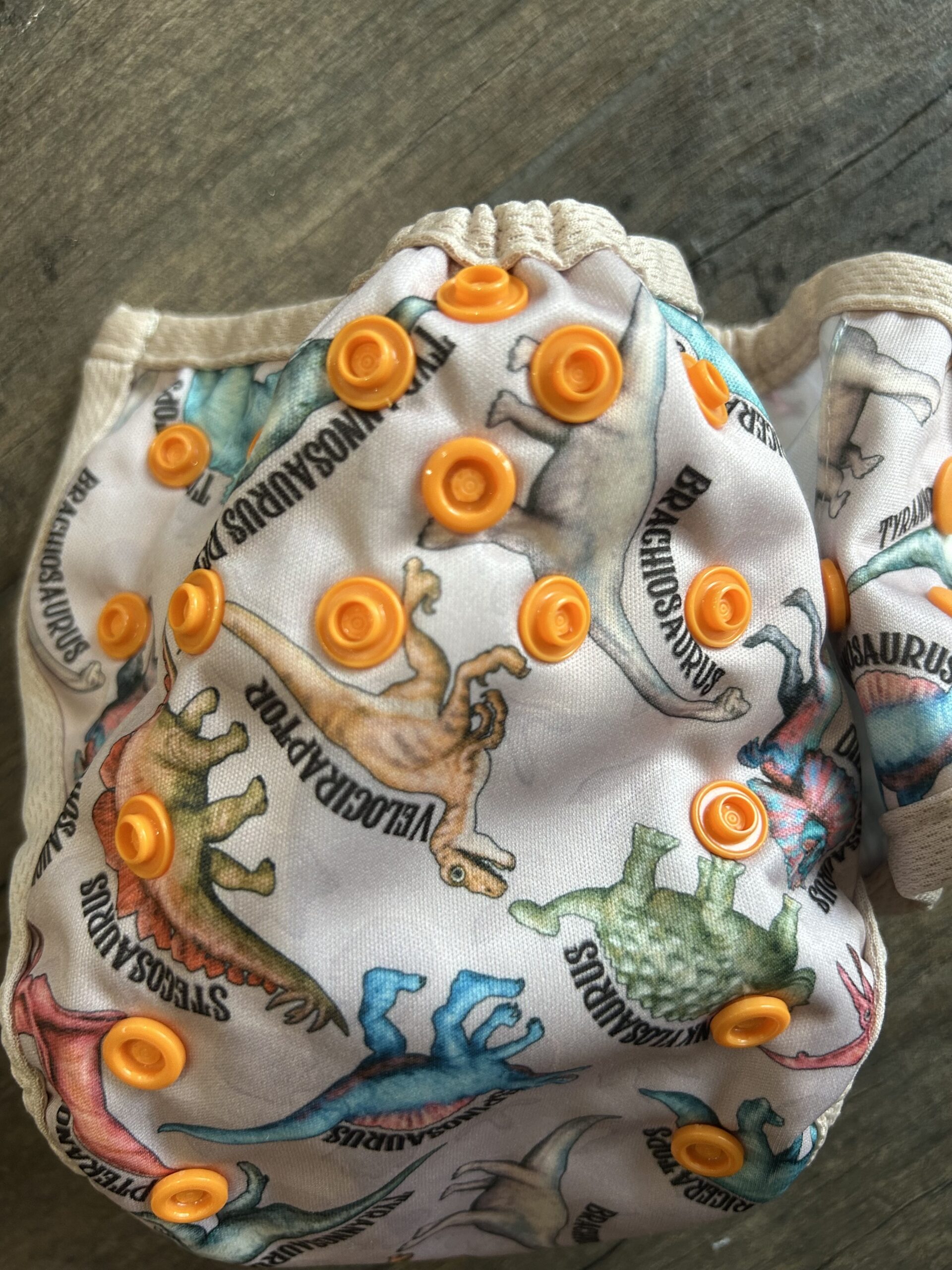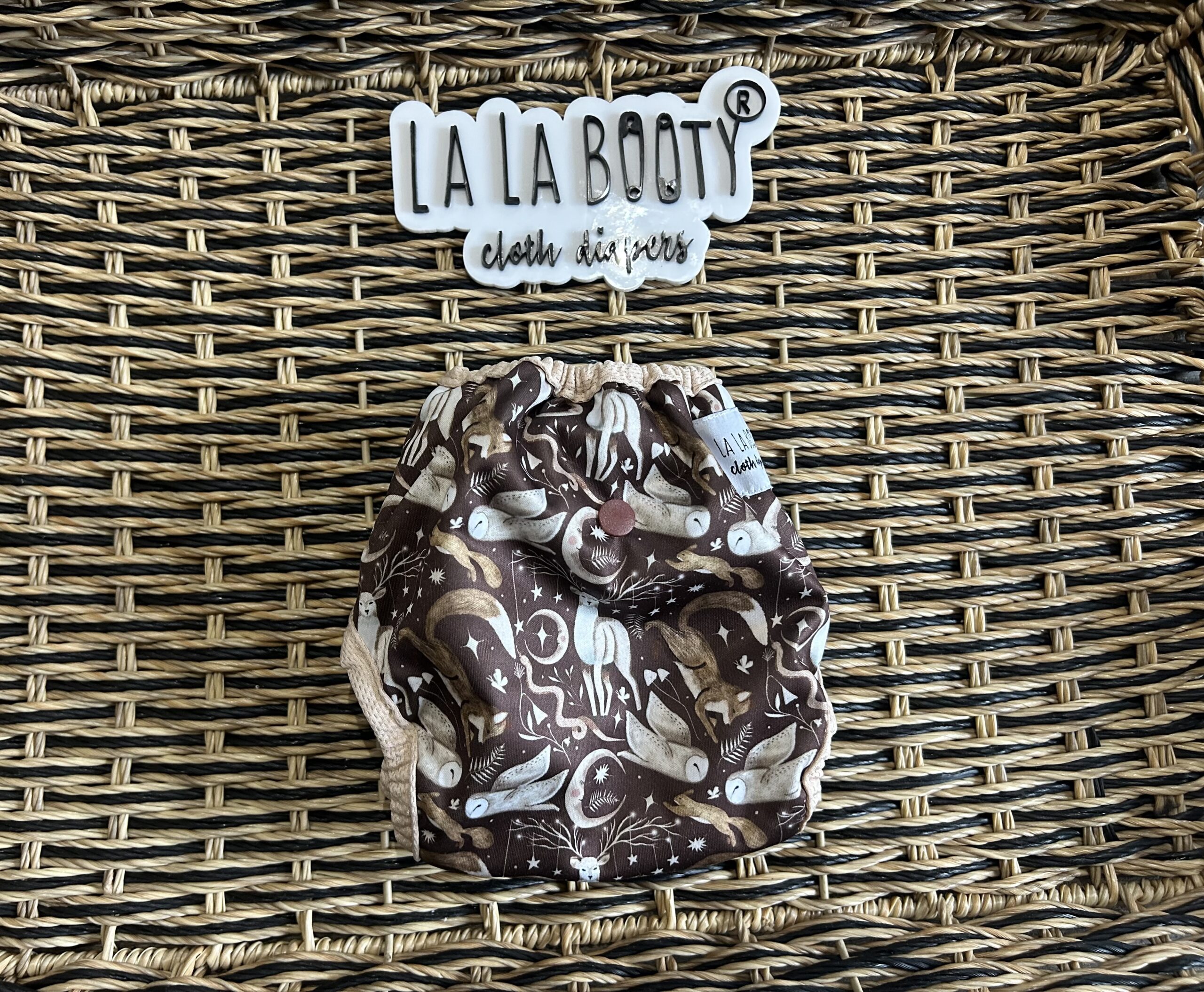 This design features front elastic, an umbilical cord snap down, rise snaps to adjust the length, lower level hip snaps, pop up gussets if you want to use them over a fitted, prefold, flat or preflat. The snap for the insert is in the back to pair with the matching littlest (newborn) sized inserts.
