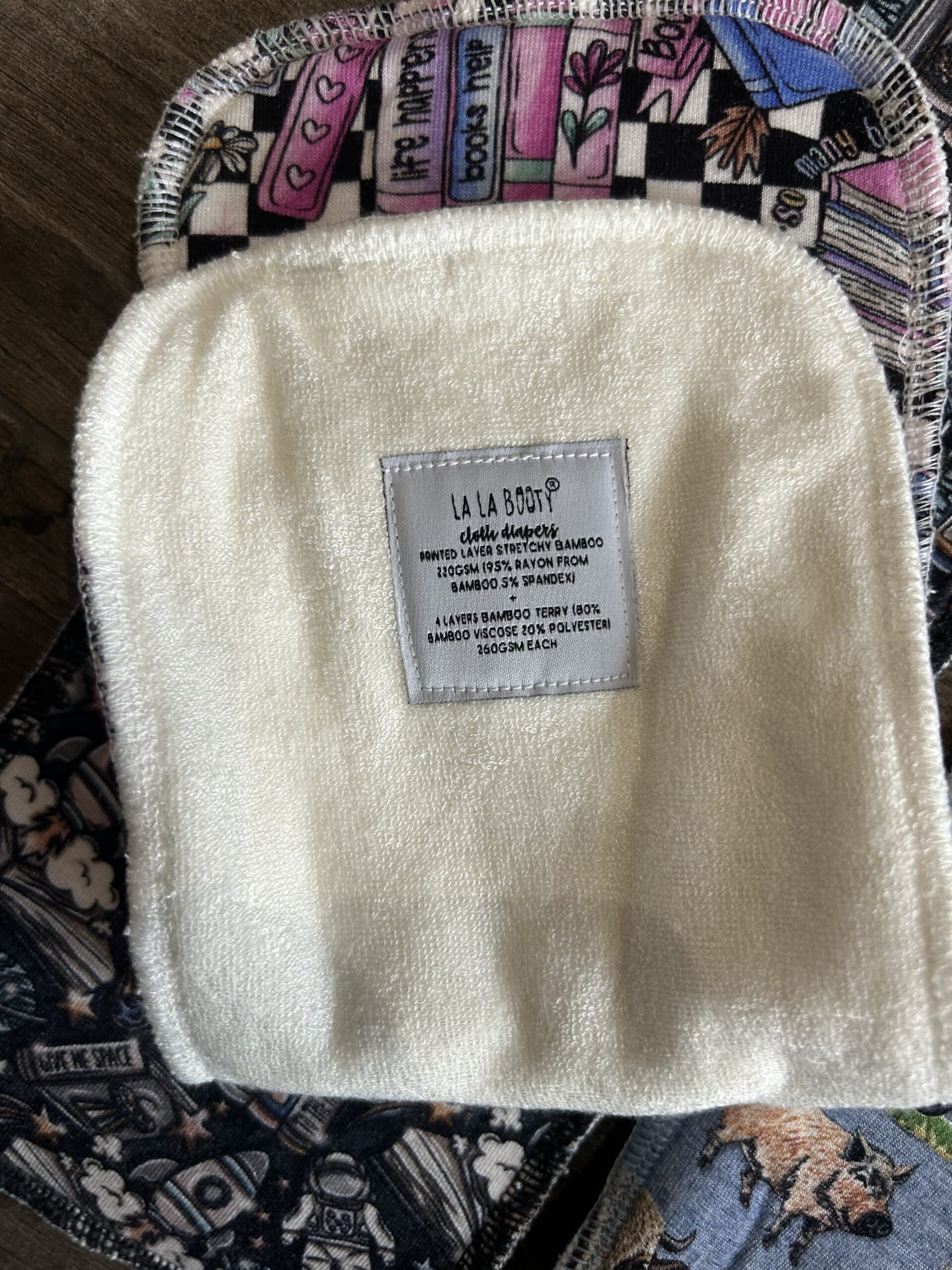 Outer Shell: 100% Polyester PUL fabric, Matching 5 layer insert: 4 layers of Bamboo Terry (80% Bamboo Viscose + 20% Polyester 260 gsm per layer) + 1 Layer of matching Printed Bamboo (95% Bamboo Rayon 5% Spandex)